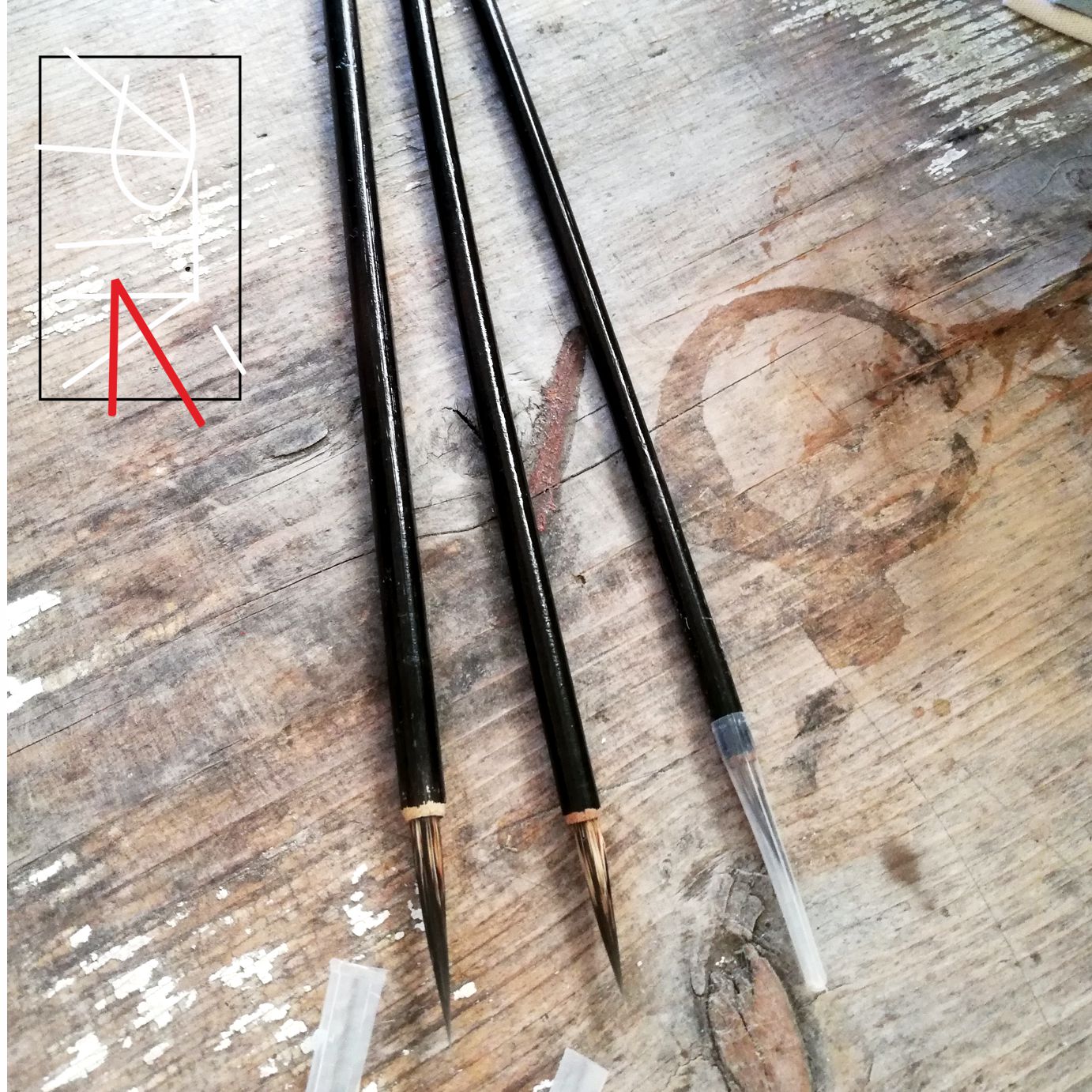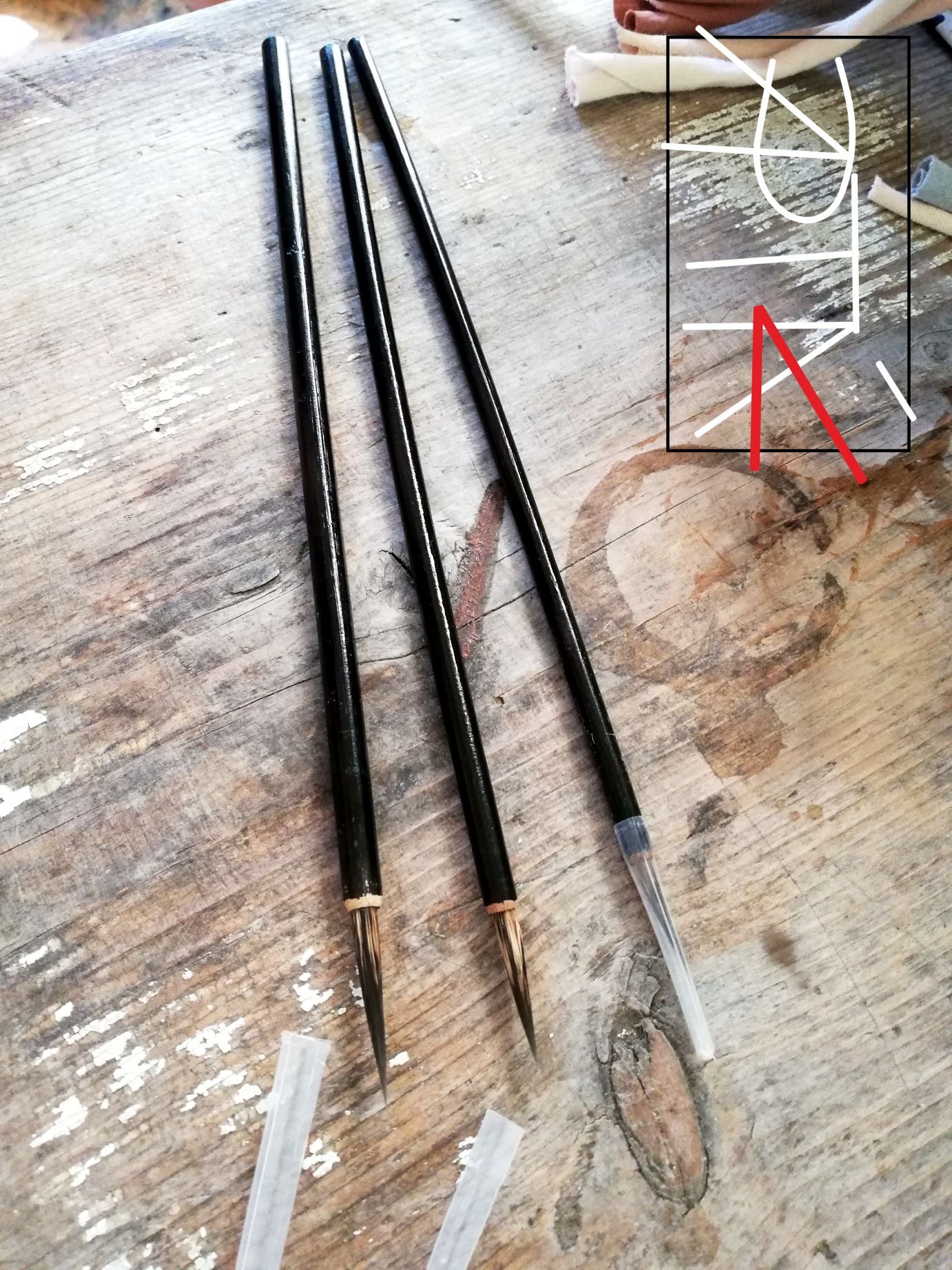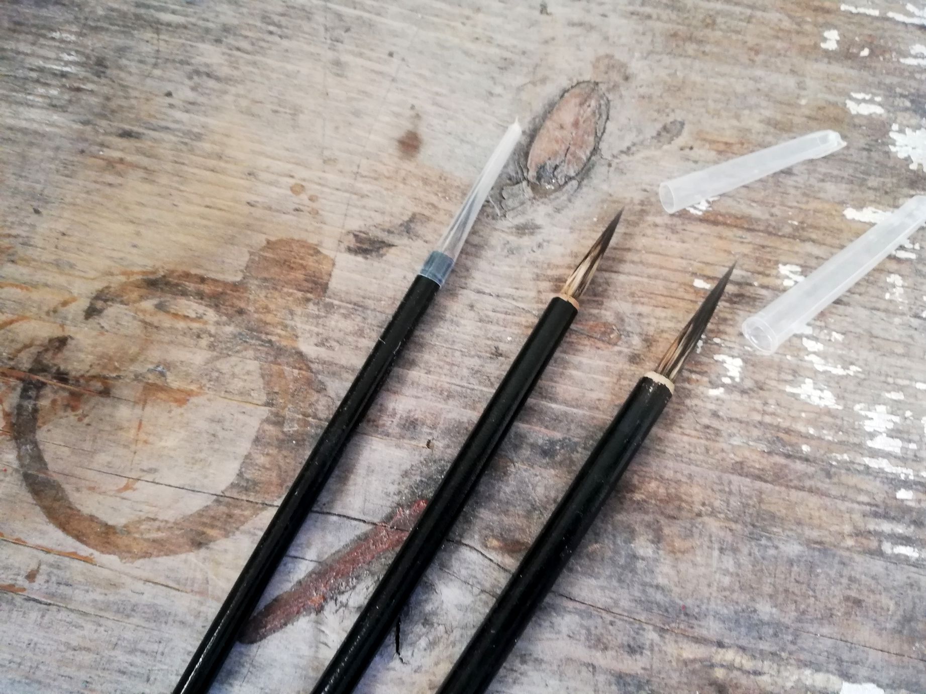 "Vlasy" z lasičky, spíše jde o tenčí štětečky; rukojeti jednoduché, nezdobené, netvarované.